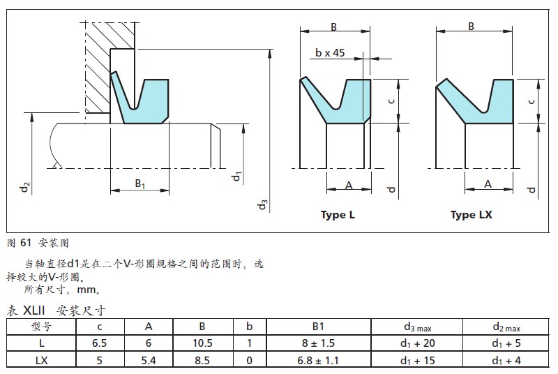 VL形水封安裝不需設計安裝倒角。VL形水封為彈性體,可以被拉伸后推置于其它零件上,VL形環(huán)最大可拉長20%,因此極易安裝。